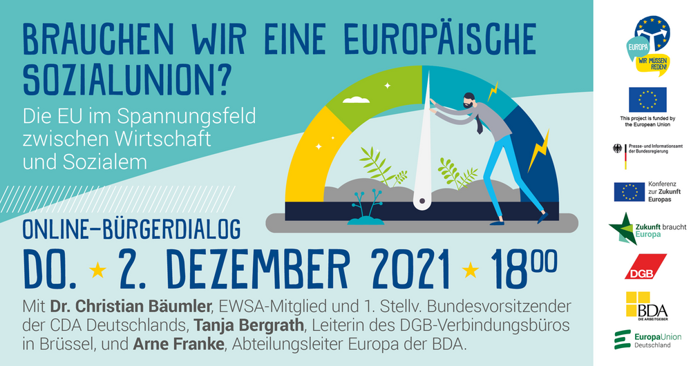 Wir laden Sie am Donnerstag, den 2. Dezember 2021, um 18 Uhr, herzlich zu unserem Online-Bürgerdialog „Brauchen wir eine Europäische Sozialunion? Die EU im Spannungsfeld zwischen Wirtschaft und Sozialem“ ein. Bringen Sie Ihre Anliegen und Fragen ein und treten Sie in den virtuellen Dialog u.a. mit: