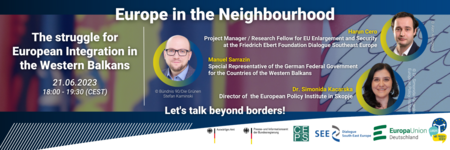 Wir laden Sie am Mittwoch, den 21. Juni 2023, von 18:00 bis 19:30 Uhr herzlich zu unserem englischsprachigen Online-Bürgerdialog „Europe in the Neighbourhood - Let's talk beyond borders! The struggle for European Integration in the Western Balkans" ein. Bringen Sie Ihre Anliegen und Fragen ein und treten Sie in den Dialog unter anderem mit: